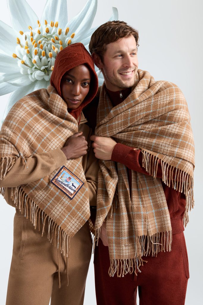 Chi non è presente con uno spazio di proprietà, opta per altre formule, come quella del “takeover”, ossia l’occupazione provvisoria di spazi altri, di hotel o istituzioni nei quali mettere in mostra il proprio “armamentario estetico”: è il caso di Harmont&Blaine, presente nello ski Lodge di Chalet Tofane a Cortina, personalizzando mobili e wallpaper con il proprio simbolo, quello del bassotto, che ricopre le pareti (anche nei soggetti dei quadri) o tradotto su sculture di legno. Un esperimento immersivo che fa parte della più ampia partnership triennale che il brand ha firmato con il ristorante, e che si traduce anche in una capsule collection intessuta in materiali pregiati, come velluto, pelle e cachemire, e che sarà svelata nei prossimi mesi. Si chiama Cortina a Colori e parte da una tote bag in tessuto camiceria con stampa check per poi creare un guardaroba da indossare anche ad alta quota, ispirato alla bellezza riflessiva delle Dolomiti: composto di maglioni con fantasie check e motivi Fair Isle, overshirt, tute in maglia e pantaloni a coste, sciarpe oversize e piumini, non mancano una serie di accessori, tra cui, gli scarponcini hiking con interno in pelliccia.